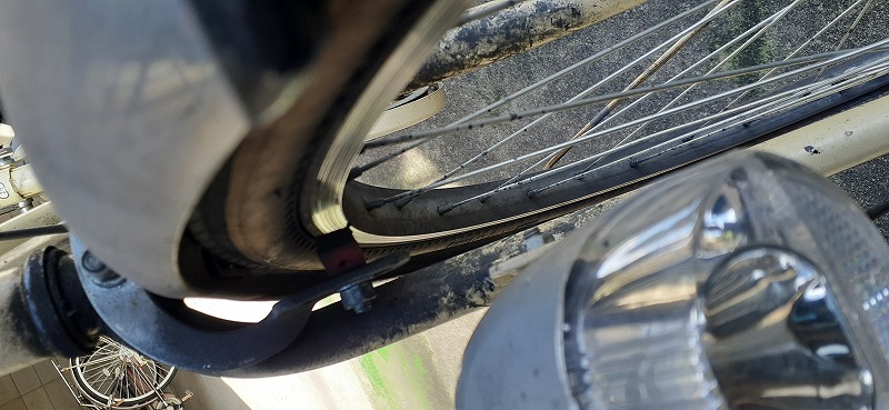 ブレーキレバーがグリップに当っても効いていません。坂の多い地域でこの状態は危険です。