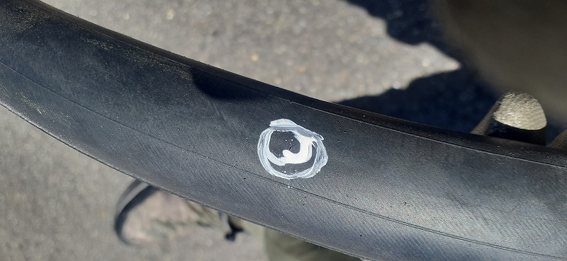 パンク後に走行もしてますのでタイヤマークとバルブ位置がこれだけずれています。