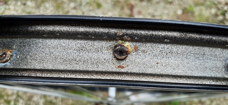 バルブ付近でパンク防止剤が漏れ出し弊害でホイール内に広がりニップル等の腐食が見られます。