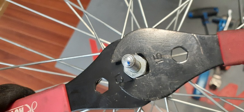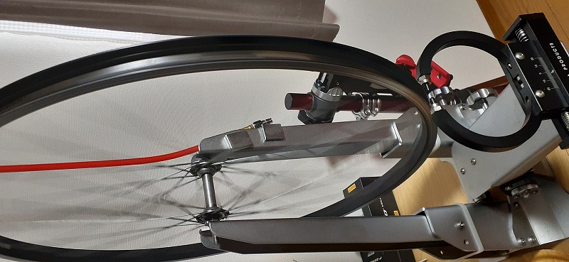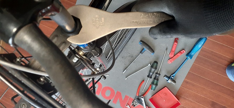 チェーン、変速機等に負荷が掛からないようにホイールを外し