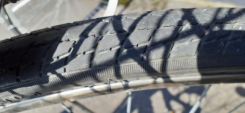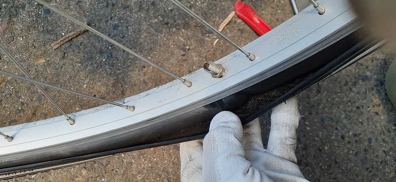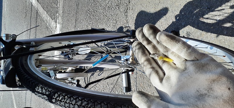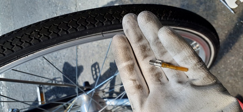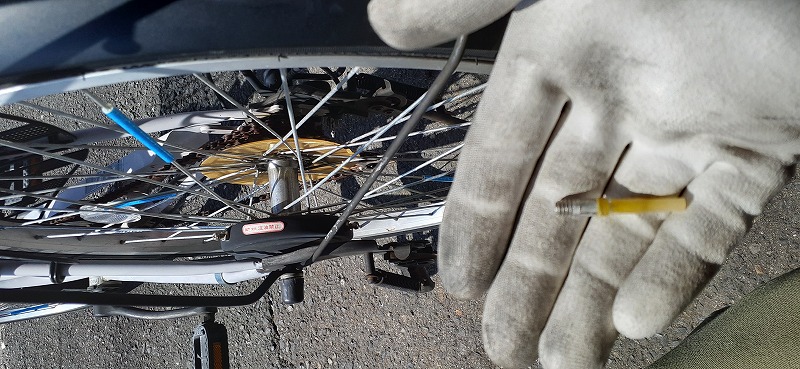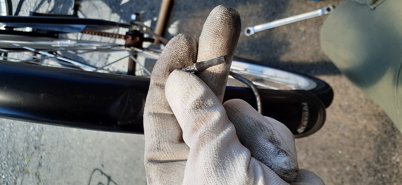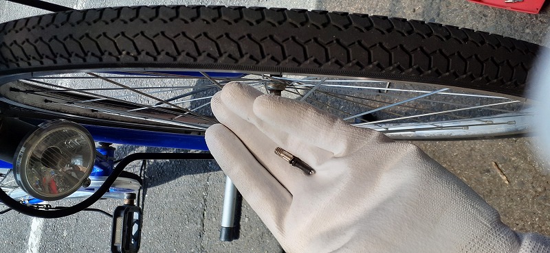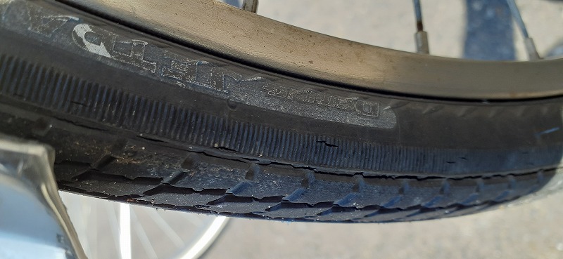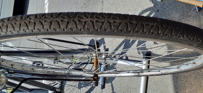 2台目は前後の虫ゴム交換、前後ブレーキ調整、各部注油、全体の点検整備を行います。空気圧不足でチューブがずれていました。このまま使い続けると確実にパンクしますので入れ直して作業完了です。