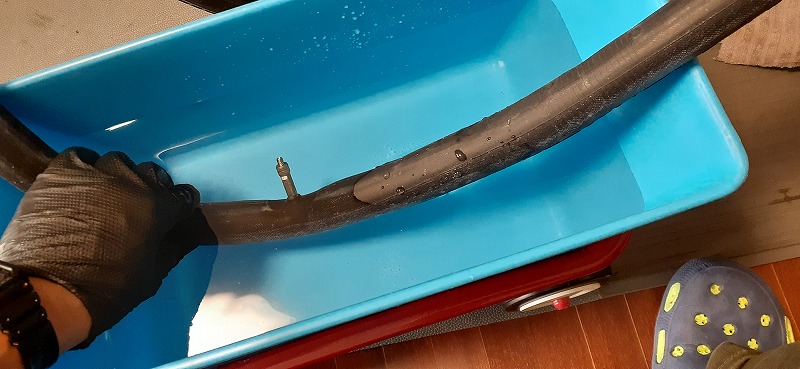 虫ゴムが明らかに劣化して機能していませんので交換して水調べをしチューブに穴が空いていないか確認をします。