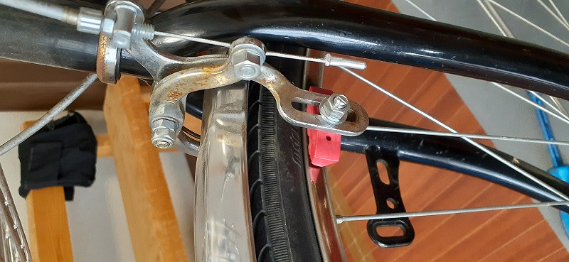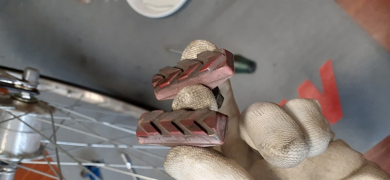 シューは経年劣化で硬化してます。 リムはステンレス製でアルミ製に比べると元々ブレーキの効きが甘いのでシューが硬化するとよりブレーキの効きが悪くなります。